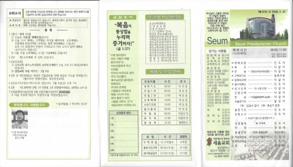 260222 교회주보 세움교회 2026-02-22 17:05 155 0 - 첨부파일 : 260222 교회주보 앞면.jpg (513.0K) - 다운로드 0 2026-02-22 17:05:19 - 첨부파일 : 260222 교회주보 뒷면.jpg (557.2K) - 다운로드 0 2026-02-22 17:05:19 이전글 다음글 목록 본문 260222 교회주보 댓글목록0 등록된 댓글이 없습니다.