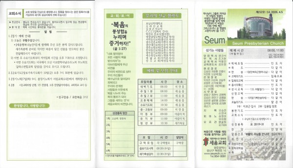 260405 교회주보 세움교회 7시간 13분전 1 0 - 첨부파일 : 260405 교회주보 앞면.jpg (569.6K) - 다운로드 0 2026-04-05 16:40:39 - 첨부파일 : 260405 교회주보 뒷면.jpg (704.0K) - 다운로드 0 2026-04-05 16:40:39 다음글 목록 본문 260405 교회주보 댓글목록0 등록된 댓글이 없습니다.