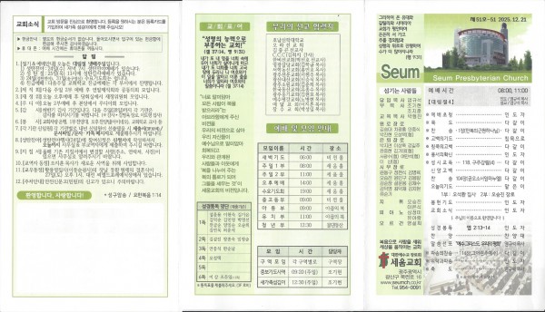 251221 교회주보 세움교회 2025-12-21 20:14 34 1 - 첨부파일 : 251221 교회주보 앞면.jpg (527.9K) - 다운로드 0 2025-12-21 20:14:43 - 첨부파일 : 251221 교회주보 뒷면.jpg (555.4K) - 다운로드 0 2025-12-21 20:14:43 이전글 다음글 목록 본문 251221 교회주보 댓글목록1 세움교회님의 댓글 세움교회 2025-12-21 20:15 + 추가광고 [당회] 2부예배 후 임시 당회가 있습니다. + 추가광고 [당회] 2부예배 후 임시 당회가 있습니다.